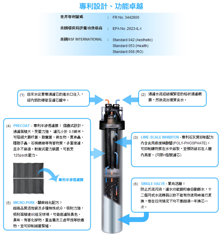 擁有近八十年專業淨水經驗的愛惠浦(Everpure),為九成美國商業提供淨水服務,更暢銷120多個國家。它的H型濾水器系列更是擁有四項專利技術,全面濾淨水中的致癌物、重金屬、細菌等等: