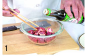 1.牛柳切粗粒,用少許生抽、糖、胡椒粉醃15分鐘。(圖1)