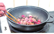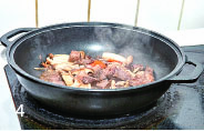 4.再爆香餘下薑、乾蔥、蒜、紅蘿蔔花,放進雜菌菇翻炒一會後,再將牛柳粒回鑊。(圖4)