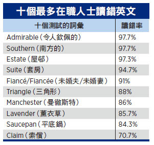 學術總監Wennita Fong分析,發音錯誤的3個主要原因,第1是重音錯,例如三音節的名詞「triangle」、「Manchester」、「lavender」,重音應在第一個音節,但不少人誤以為重音在中間。第2個原因是錯用「母音」(vowel),如「suite」、「claim」等;第三個原因是不熟悉由其它外語字借來的英語,例如將法文的「fiancé/fiancée」讀錯成finance(金融)或France(法國)。她又相信可能與求學時期教師發音不標準,加上平日亂寫「港式英語」等有關。她建議市民學習「國際音標」,多聽多講,逐步改善英語能力。◇