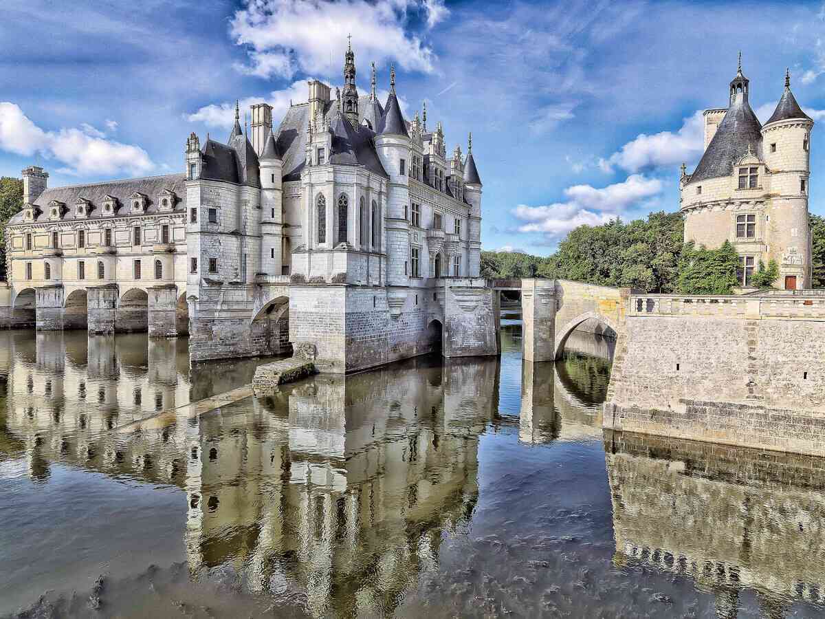 這些城堡風格各異,在法國輝煌的歷史上各領風騷,不少古堡都留下了王室的奇聞軼事的傳說,其中最壯觀的城堡是香波爾城堡,最美麗的城堡便是水上城堡——雪儂梭城堡(Chateau de Chenonceau)。這座城堡左右兩翼分跨盧瓦爾河支流謝爾(Le Cher)河兩岸,中間由五孔廊橋相連,常被譽為「停泊在謝爾河上的船」。它位於昂布煤氣(Amboise)以南約12公里,圖爾(Tours,在路易十一時期曾作為法國的首都)以東約34公里處,靠近雪濃梭(Chenonceaux)小村落。現今,雪儂梭城堡是法國除凡爾賽宮以外,參觀人數最多的城堡。