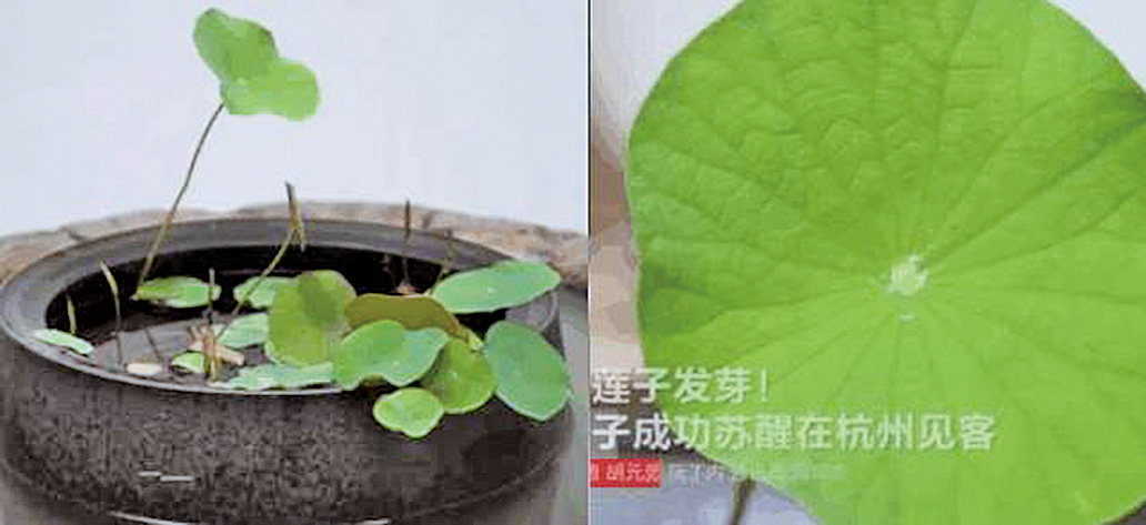 據報,此蓮子於2年前,在山東濟寧北宋土層中出土,由中國美術學院李崢嶸博士帶回精心培育。一段時間後,竟生出嫩綠莖葉,重現生機。