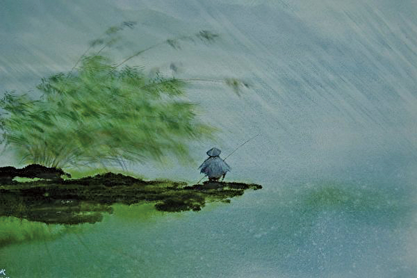 遠處迷濛秀潤的山影,江面蕩漾輕巧的水珠,是如此的和諧、相容與完美。在這山水的顧盼間,在這率性的平淡裏,讓青篛笠、綠蓑衣的一介凡夫,剎那間與天地冥合,與萬物為一。在此刻,甚麼都淡了,不只忘歸,也不須歸,更早已忘卻了自我。那麼,肥美的魚兒呀,請「願者上鉤」吧!