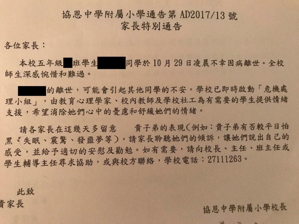 網上流傳一張協恩中學附屬小學的通告,指該校一名五年級女生周日(29日)不幸因病離世,校方對此深感惋惜和難過,已啟動危機處理小組,向有需要的學生提供情緒支援,並希望家長留意學生的情緒。