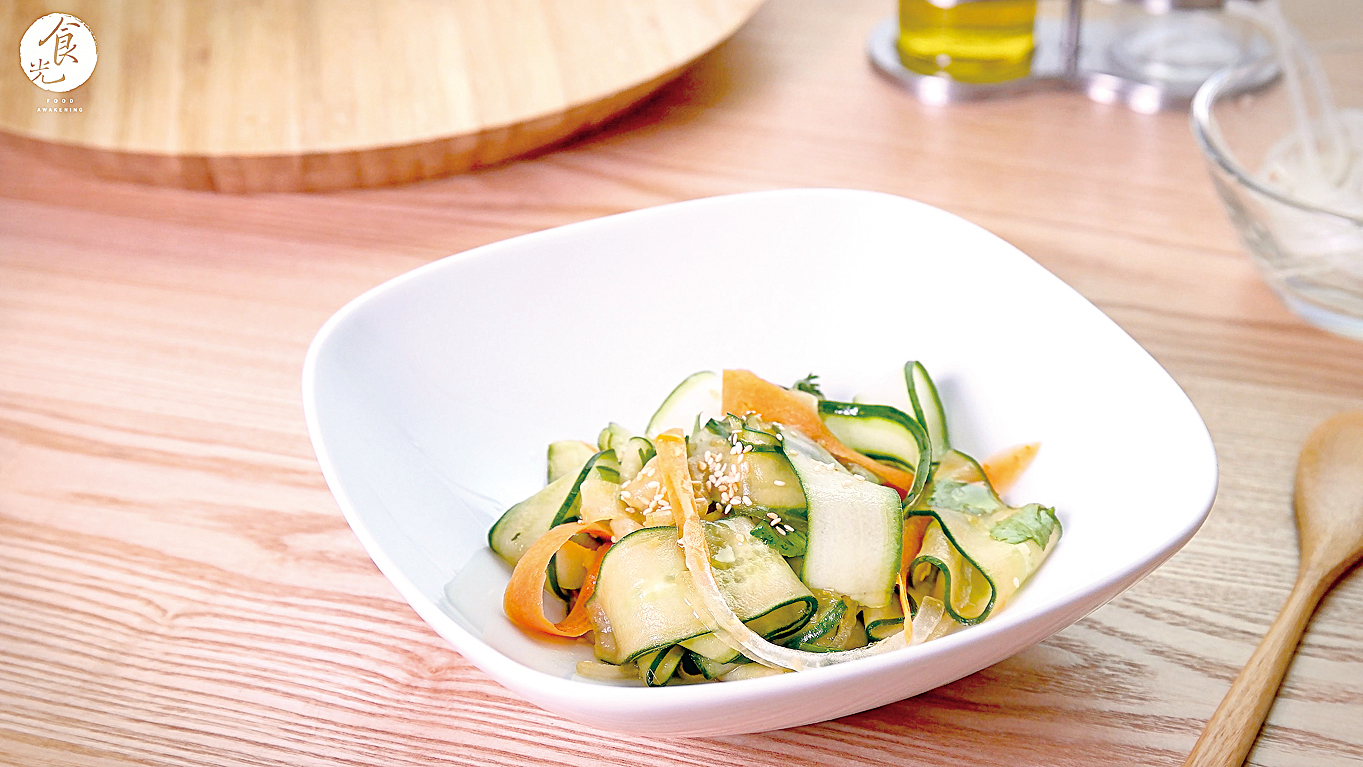 炎炎夏日食慾不振,這時來個涼拌青瓜是個不錯的選擇。酸甜醬汁可以增加食慾,除此之外我們在醬汁中加了一點薑末,可以幫助發汗袪濕。