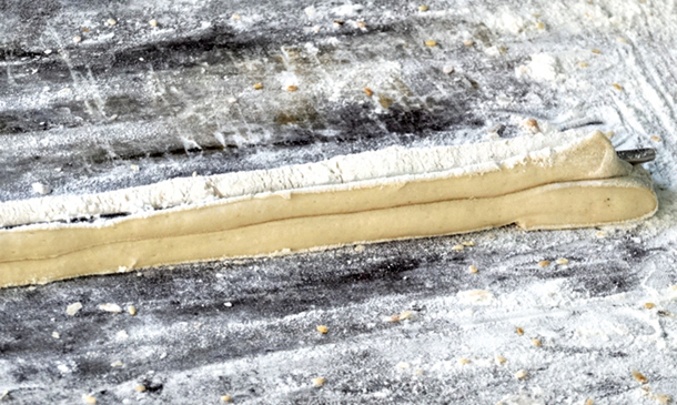 2. 將發好的麵團搓揉後拉成長條,再切成1.5厘米寬、7厘米長的油條胚子,把兩條胚子疊在一起,用筷子將中部按緊。