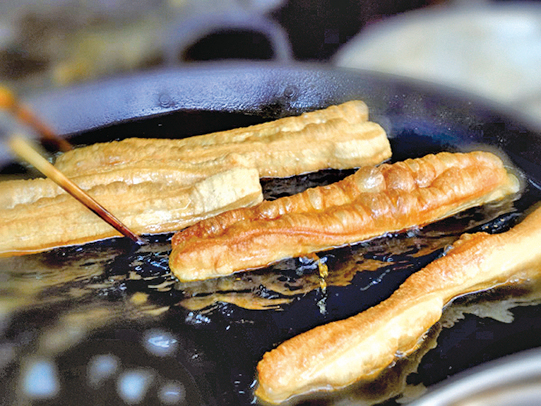 3. 放入熱油鍋前,油條胚子的兩頭再拉長約15厘米,邊炸邊翻動,待其完全膨脹、呈金黃色,即可取出食用。