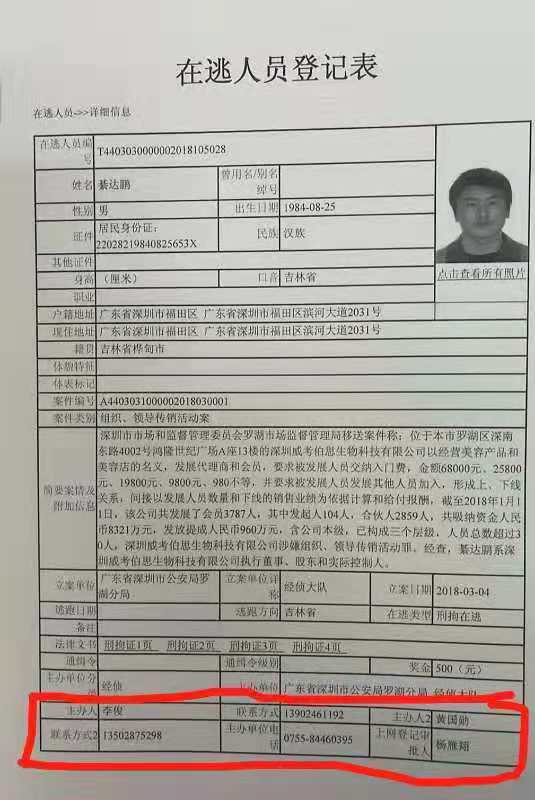 值得注意的是,官方在逃人員登記表顯示,2018年3月4日綦達鵬等人已被立案,綦達鵬「刑拘在逃」。但是此後 ,他們不但沒有被捉拿歸案,反而招搖過市,在全國各地大肆招商。