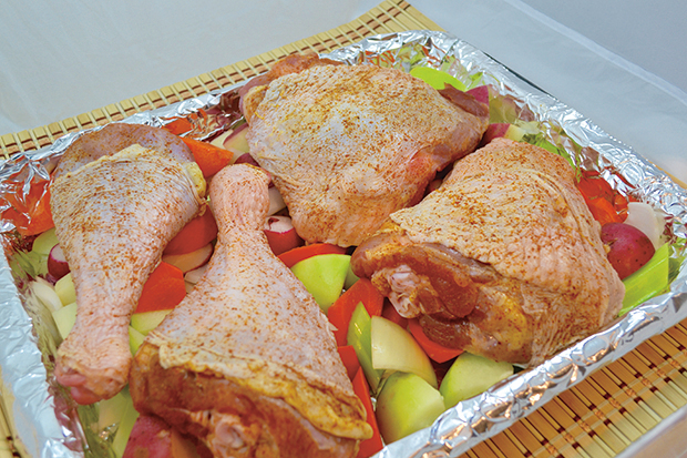 3.把蔬菜鋪在盤底,雞腿在上,倒入白酒、雞湯,放進焗爐烤25分鐘。