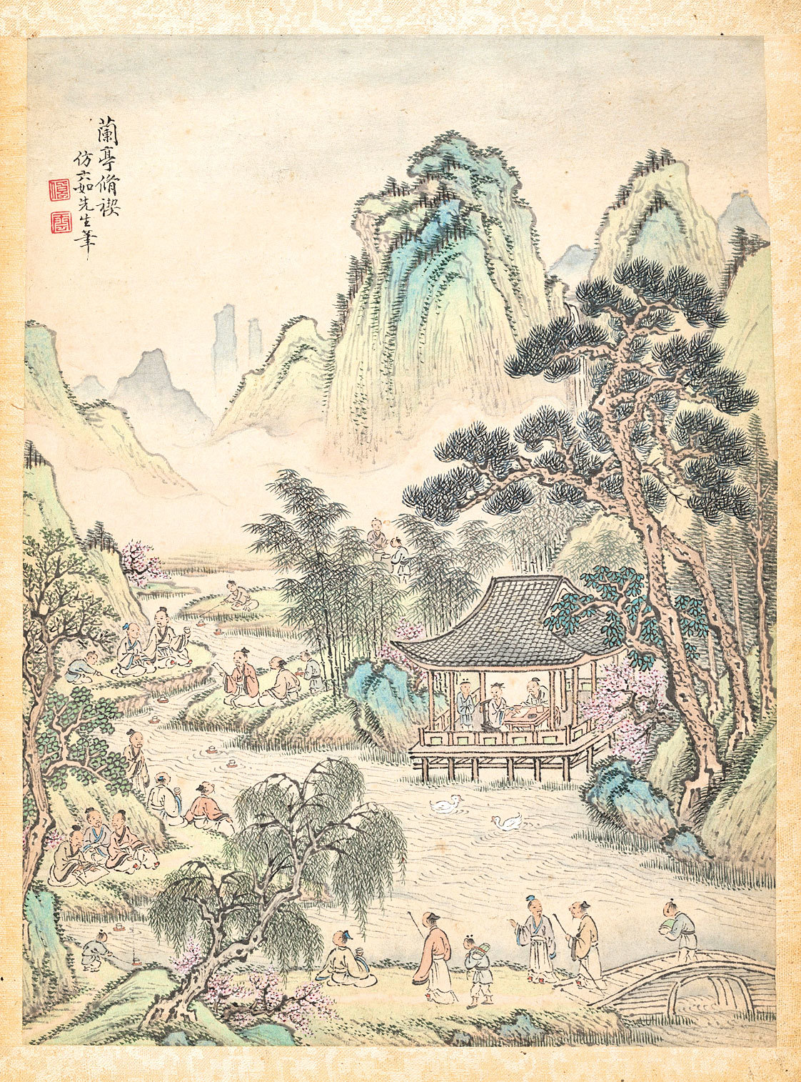 例如以《蘭亭雅集》為主題的畫作,習慣在畫面中安置一群文人緣溪而坐,典故便是來自4世紀時的晉代,當時文豪如王羲之與其友人在休憩日相聚於蘭亭,曲水流觴,吟詩屬文,感悟人生,時人引以為美談。