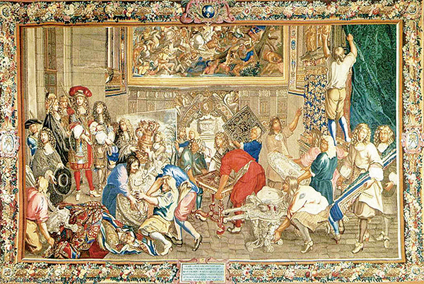 歐洲掛毯工藝(Tapiserie)始自寒冷的北方,首先在紡織業興盛的法蘭德斯一帶蓬勃發展,文藝復興時期已出現了不少令人驚豔的名作,如1525年於布魯塞爾製作的〈大衛王與巴氏芭〉系列。法國掛毯也有悠久的歷史,自中世紀以來也有安如公爵路易一世訂製的巨幅〈啟示錄掛毯〉系列、與作者不詳的〈淑女與獨角獸〉等出色的作品。亨利四世時期,對法蘭德斯藝術情有獨鍾的皇后瑪麗美第奇,特別請來法蘭德斯的掛毯織工,在戈布蘭染坊租用廠房,專為皇室製作掛毯。到法王路易十四時期,在財政大臣柯爾貝(Jean-Baptiste Colbert)的政策推展下擴大規模,最終成為享譽國際的法國國寶級工藝產品。