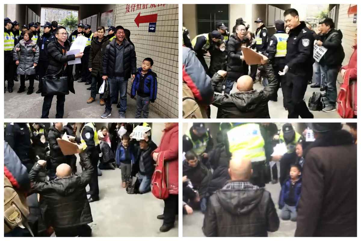 影片顯示,一名男士也頭頂訴狀跪在地上哭訴,跪在地上的還包括跟隨他上訪的一名男童。他們後來被允許派五名代表進去會談。