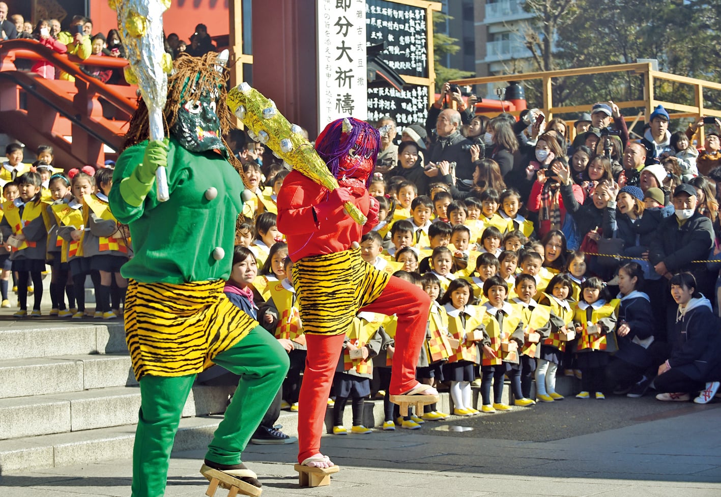 據說孩子們將炒熟的大豆撒向屋外的惡鬼,並吃下與自己年齡相等數目的福豆,就會獲得一年的安康福運,因此這一天的民俗活動經久不衰,熱鬧非凡。