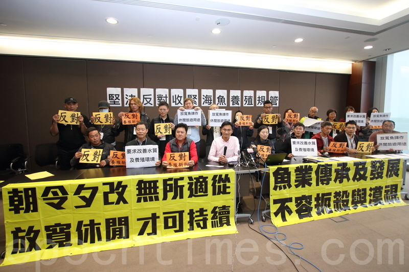 漁護署計劃收緊養魚排續牌條件,二十多名養魚戶昨日在立法會議員朱凱廸陪同下舉行記者會,表明反對署方收緊海魚養殖牌照建議。
