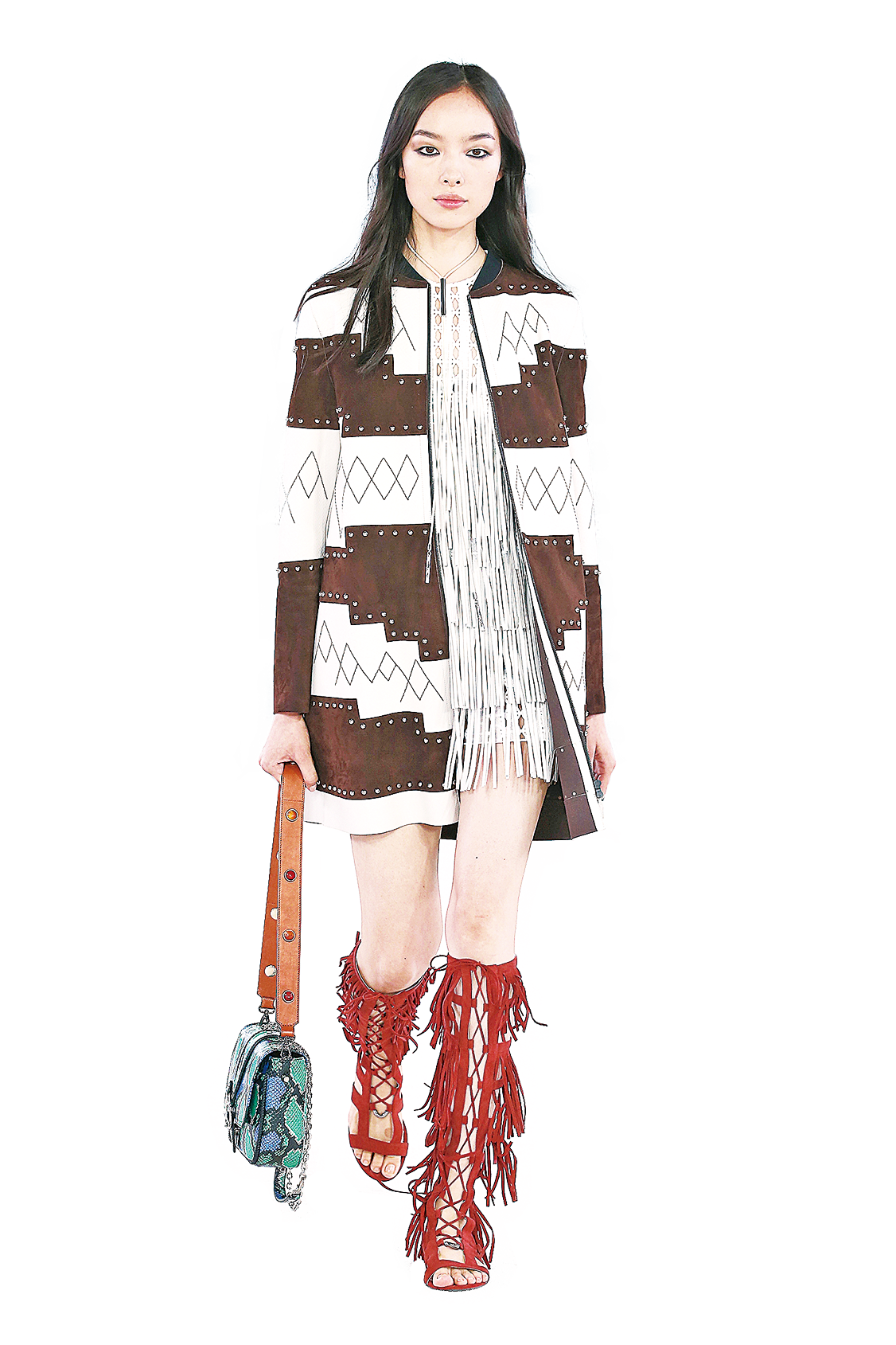 整個系列仍以品牌鍾愛的70年代波西米亞風格為主調。色彩明快的幾何印花不斷出現在雪紡裙上,搭配結構精巧的短款上衣或針織背心,傳遞出如Anita Pallenberg那樣強烈的早期偶像風格;腰帶是不可忽視的造型重點,幾乎出現在每一套Look中。無論是色彩繁雜的印花襯衫,織花毛衣,還是幾何圖案裙裝,都搭配一條寬腰帶,來協調所有造型。