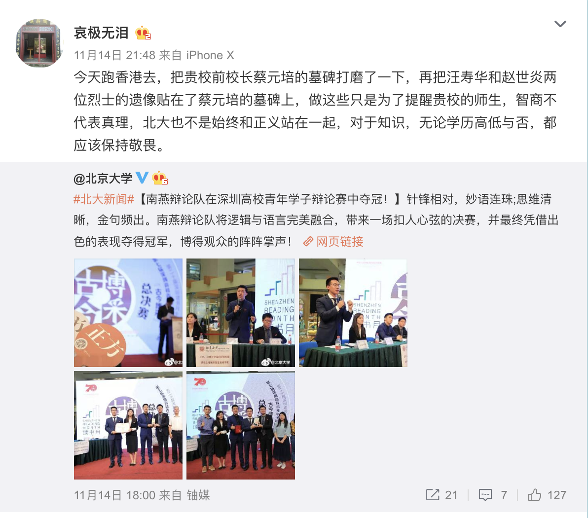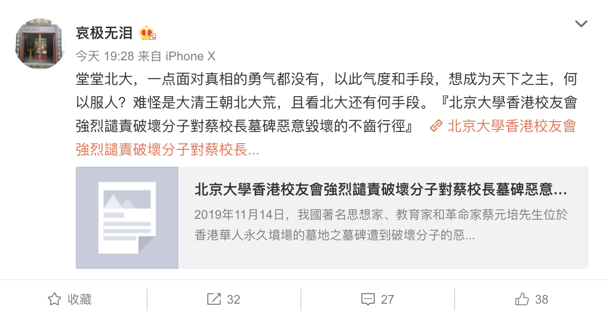 微博帳號「哀極無淚」14日在微博發文,自曝前來香港為蔡元培的墓碑「打磨了一下」。今日「哀極無淚」回應北京大學香港校友會譴責破壞墓碑事件,也無道歉之言。