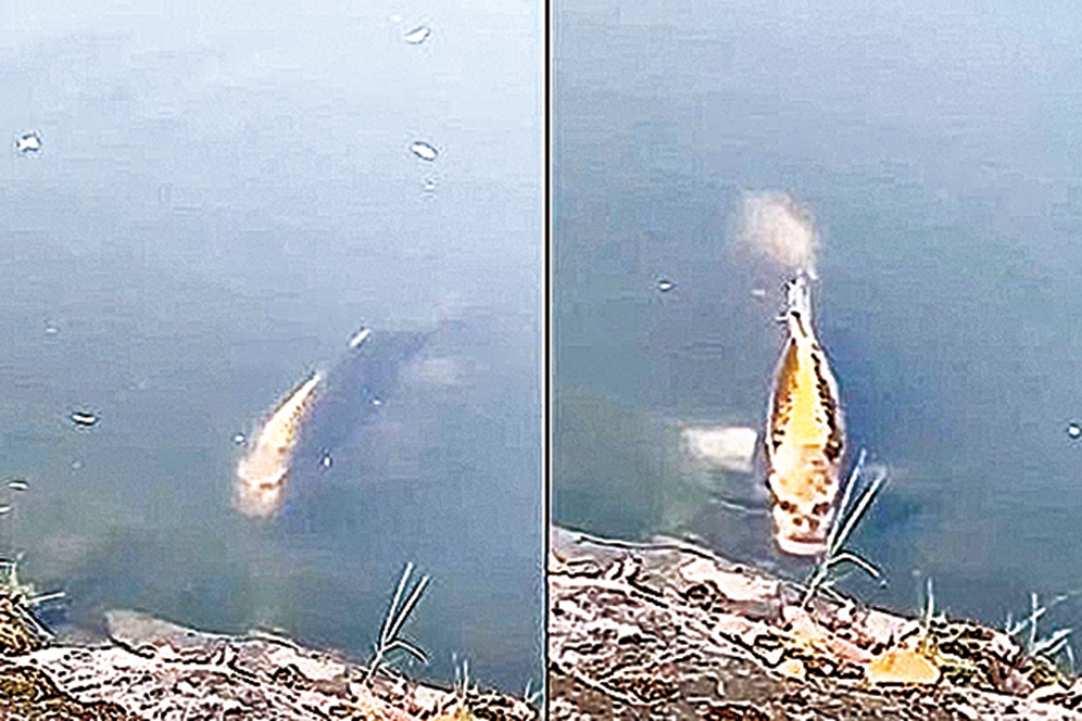 據景區工作人員介紹,這條魚的品種是黃金錦鯉,已在景區的湖中飼養了3 年。