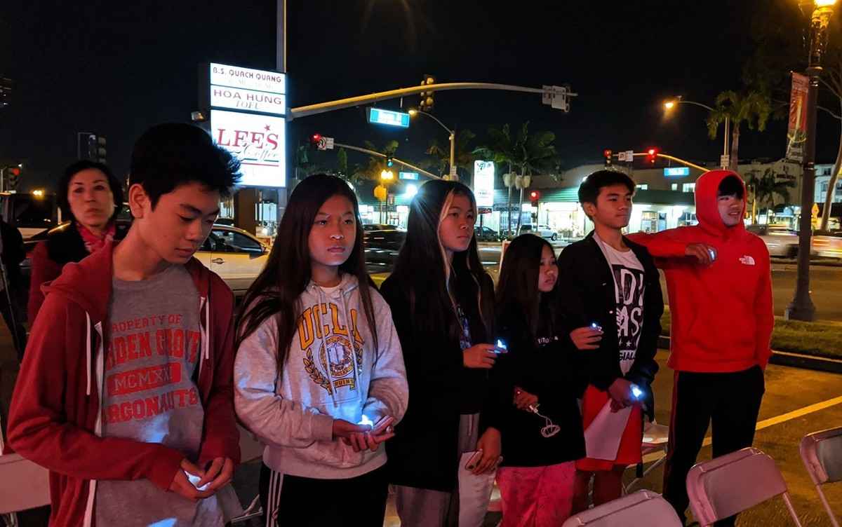 12月22日晚,橙縣西敏市(Westminster)車水馬龍的博爾薩大街(Bolsa Ave)聚集了五十餘名聲援香港的美籍越南裔民眾,他們在速食店Lee's Sandwiches前的廣場演講、歌唱,為香港人加油,最後用燭光悼念因對抗共產黨暴力而犧牲的生命。