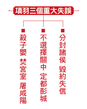 項羽的失誤主要在三方面。第一個失誤就是他在秦地殺子嬰、焚宮室、屠咸陽。