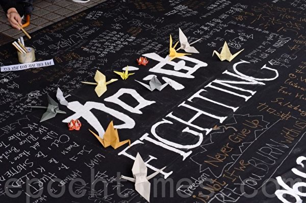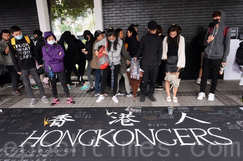 2019年12月29日,香港民眾在愛丁堡舉行香港人抗爭的日與夜集會。圖為民眾在地上的橫幅寫下心聲。(宋碧龍/大紀元)
