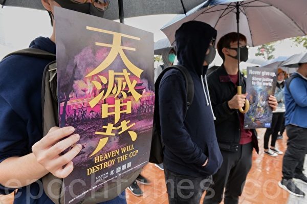 2019年12月29日,香港民眾在愛丁堡舉行香港人抗爭的日與夜集會。圖為民眾舉著「天滅中共」的標語表達訴求。(宋碧龍/大紀元)