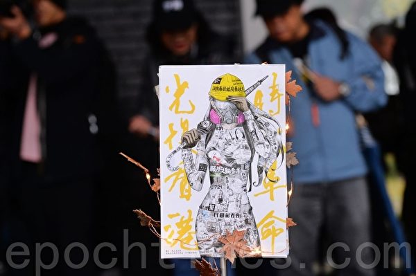 2019年12月29日,香港民眾在愛丁堡舉行香港人抗爭的日與夜集會。圖為民眾舉著「光復香港 時代革命」的漫畫和標語表達訴求。(宋碧龍/大紀元)
