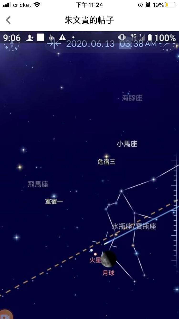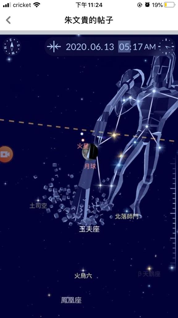 研習星相學的朱文貴先生披露,從5月底到6月13日,火星與彗星聯袂而來,入水瓶座於黃道中天後,到6月13日與海王星及月球再次會合於水瓶座之手。