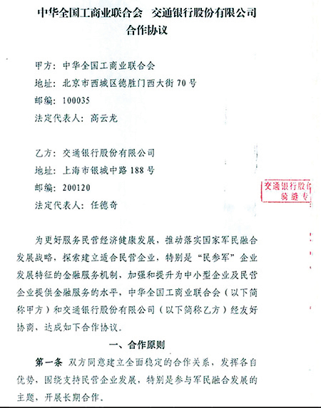 該協議的合作原則第一條提到,雙方同意「參與軍民融合」,開展「長期合作」。第二條提到,要以解決中小微企業融資問題為重點,建立銀企商聯動的新型金融服務平台。