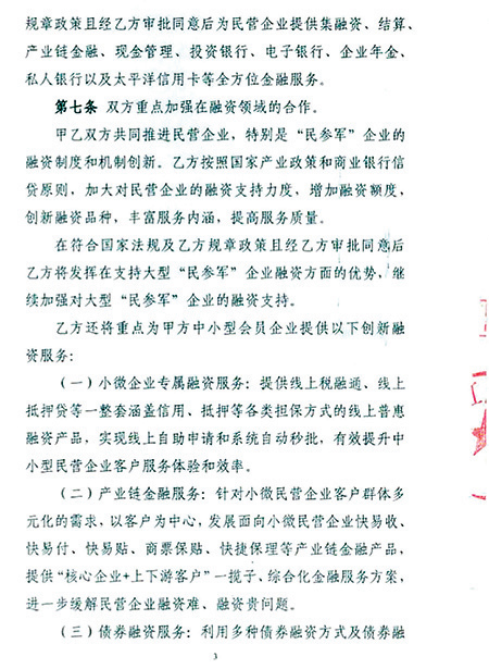 其中第七條提到,交行加大對民營企業的融資支持力度,增加融資額度,加強對大型「民參軍」企業的融資支持。