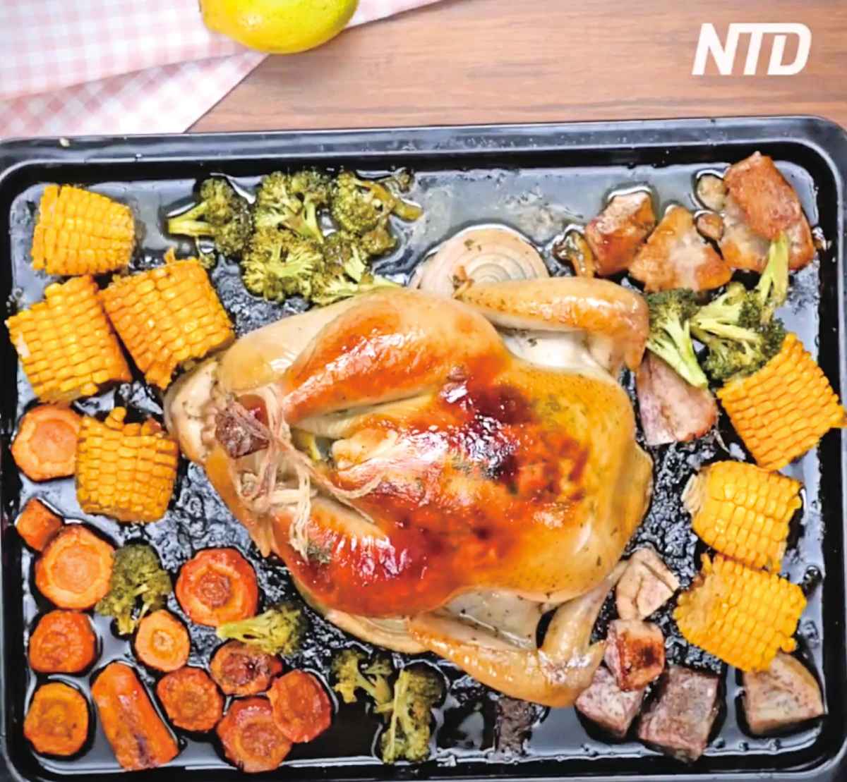 金色的烤雞看起來非常開胃,其中蜂蜜水有很大功勞,抹在雞的表皮,能促進酥脆金色外觀的形成。製作過程中的「綁腳」也很重要,有助於保持烤雞形狀。