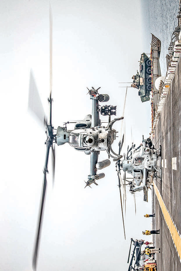 為配合兩棲登陸作戰,除大規模空襲、艦對地巡航導彈打擊外,兩棲攻擊艦配屬的一系列眼鏡蛇直升機(AH-1)等,可用於較近距離強化空中攻擊,以支援登陸作戰。