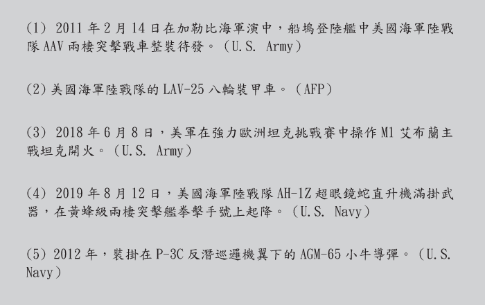 美國海軍陸戰隊還有各類小型車載和肩扛式導彈系統,用於反坦克、防空等。此外,美國陸軍還有更多空戰、陸戰武器系統,與中共軍隊接戰可能性很小,不再一一贅述。