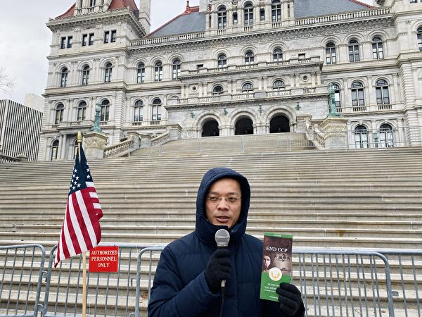 12月26日周六,在紐約州首府奧爾巴尼(Albany),自由鐘聯盟(Liberty bell alliance)舉辦支持特朗普的集會,在州府議會大廈(East Capitol Park)前,多位民眾揭露中共滲透美國,稱「中共是世界病毒」、「中共是最大威脅」、「拒絕共產主義」,並手持解體中共傳單集體大聲呼籲「END CCP」。
