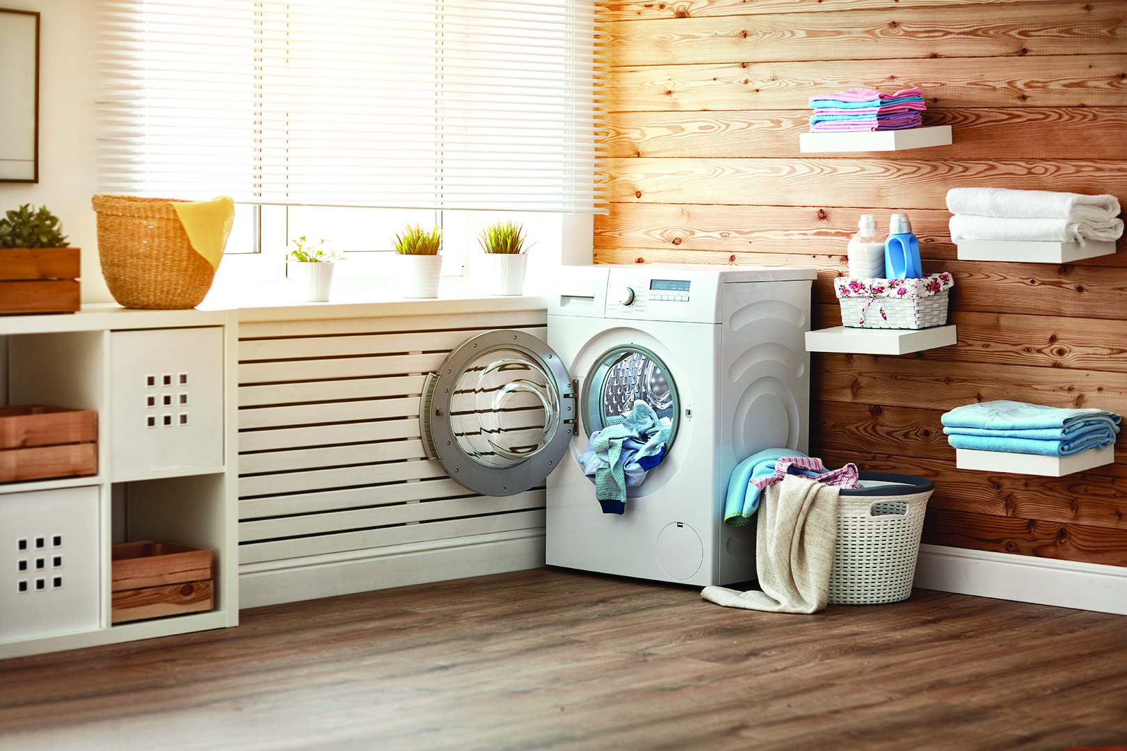 洗衣房是潮濕的地方,如果通風條件不好,容易長霉。如果有條件安裝大扇的玻璃窗,讓陽光和微風進入房間那最好不過了。可以在挨著窗戶的牆上設置一個操作平台,洗衣機和櫥櫃安排在下面,在平台的上面放置臨時的晾衣架、乾淨的毛巾等織物。