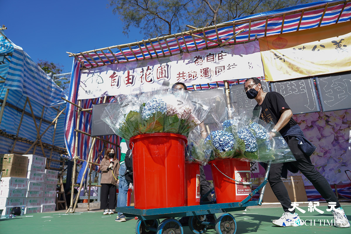 【支聯會年宵攤位遭打壓】今(6日)早約8時半,食環署人員將支聯會維園的花檔,以鐵馬及膠帶圍封,約1小時後,要求移走物品。支聯會主席李卓人和秘書長蔡耀昌與食環署人員理論,要求解釋及商討合約內容,雙方爭論後,支聯會最終將花檔內的鮮花及物品移走。@