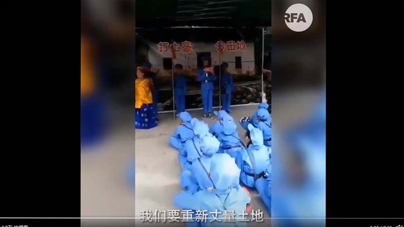新唐人報道,3月8日,自由亞洲電台中文推特分享了一段影片,內容為疑似中國某地的小學生們身穿軍服在排演,其中兩名地主打扮的演員被押在台前,主持者則宣佈所有欠條作廢,還要瓜分地主土地,讓「每個窮人家都有田分」。會場牆上,用紅筆書寫著「打土豪、分田地」6個大字。
