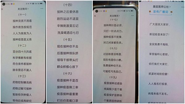 與此同時,有大陸民眾向大紀元分享了黑龍江饒河等地發出的洗腦宣傳,一系列引導接種的打油詩和順口溜令人眼花繚亂,而混亂的內容似乎透露出這是一場即興政治運動,離「科學防疫」甚遠。