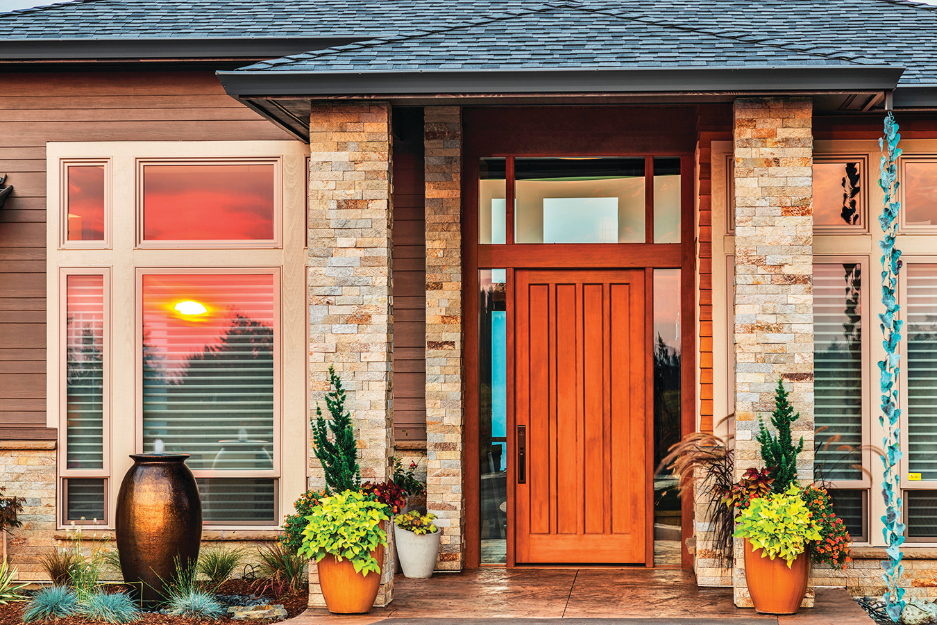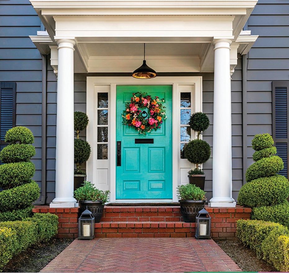鄉村風格的住宅在外觀的色彩與樣式搭配上比較自由隨性,沒有太多規範。按照傳統的做法,通常正面外牆的所有元素會統一使用一種顏色。在此建議你不妨跳脫常規,可採用灰綠色外牆搭配天然原木山形屋頂,在灰色調的色彩中加入溫度,然後大門塗上明亮的知更鳥蛋藍(Robin egg blue),讓大門與牆面形成強烈對比,利用白色的大門裝飾板、窗框、廊柱與欄杆,將原木色、綠灰色和知更鳥蛋藍結合在一起。◇
