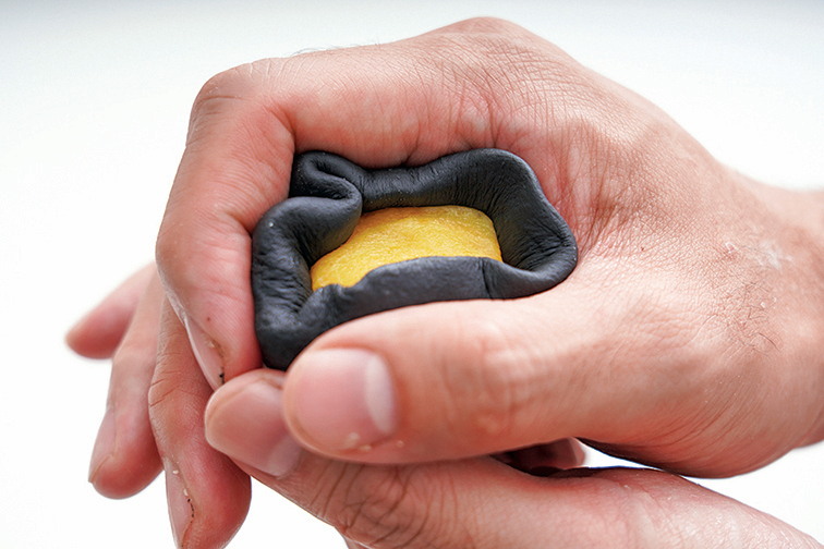 竹炭麵團(黑)120g、奶黃流沙餡4 個、食用金色色膏10g