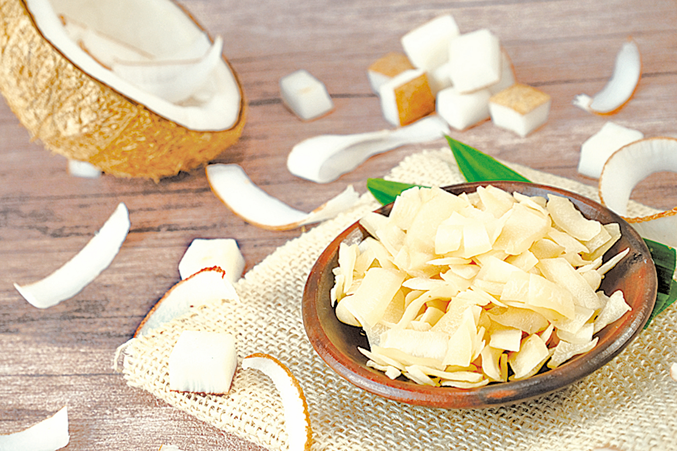 製作方法與椰絲相同,只是不刨絲,而是切成片,比椰絲大很多,也是無糖的。加入任何料理中都能增加口感,雖然椰片也可以跟著食材一起烹調,但更常用來做裝飾和配料。