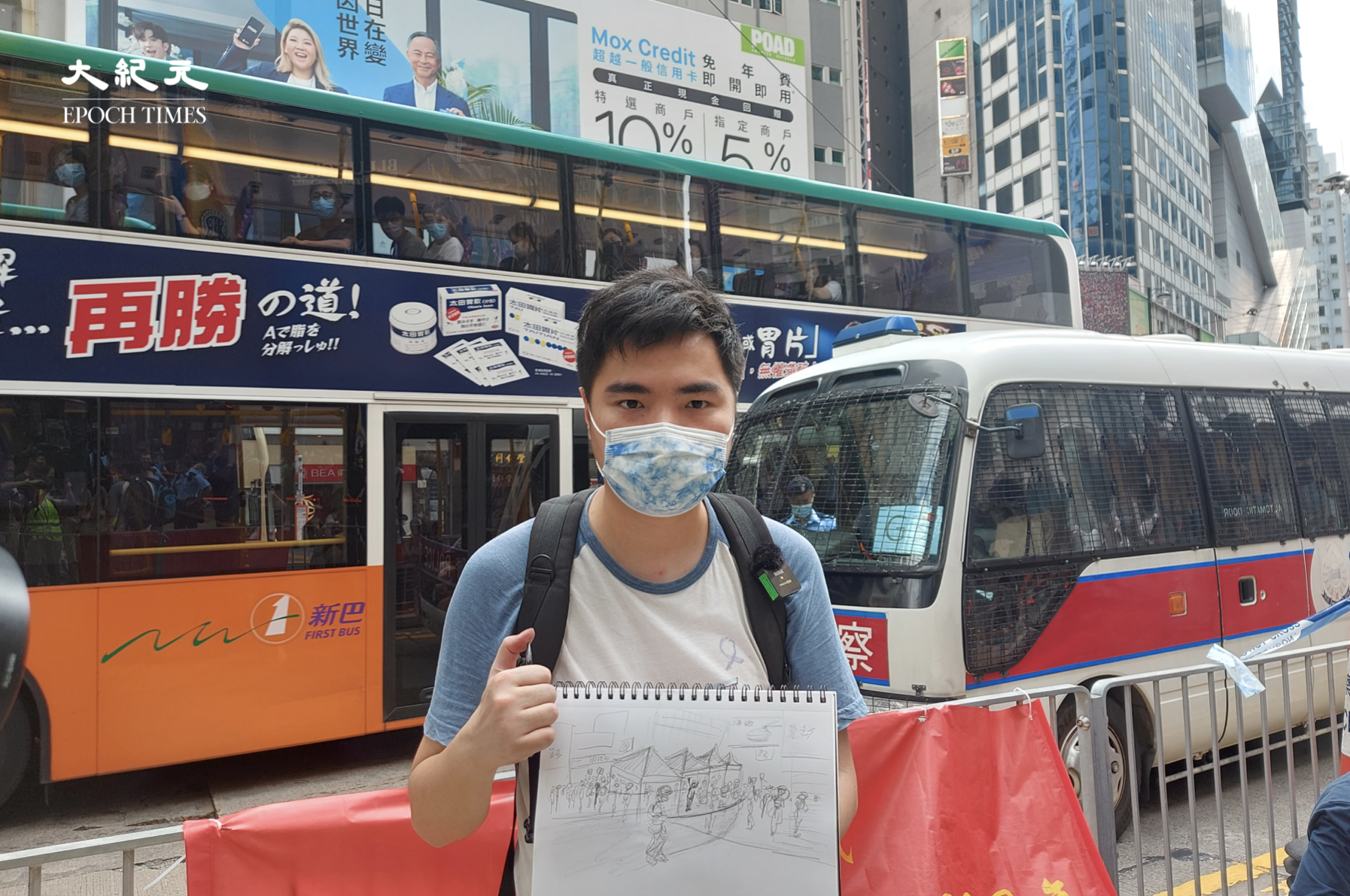 今日(7月1日)是中共建黨百年暨香港主權移交24周年。香港警方在多地嚴密佈防,銅鑼灣一帶聚集大批警力。漫畫家陳先生來到銅鑼灣,並畫了一幅警察封鎖東角道的素描。他反覆強調,現在的香港很有「特色」,沒有辦法自由、安心地發表自己的意見。