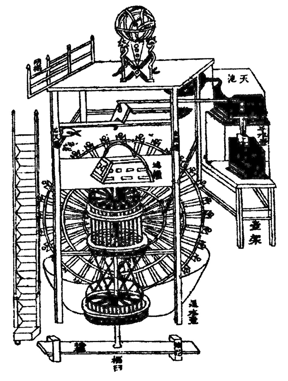 蘇頌所研製的水運儀象台是一座高十二公尺、寬七公尺,像三層樓房一樣的天文台。水運儀象台的上層是觀測天體的渾儀,中層是演示天象的渾象,下層是使渾儀、渾象隨天體運動而轉動的水力驅動裝置,還有可以報時的時鐘。