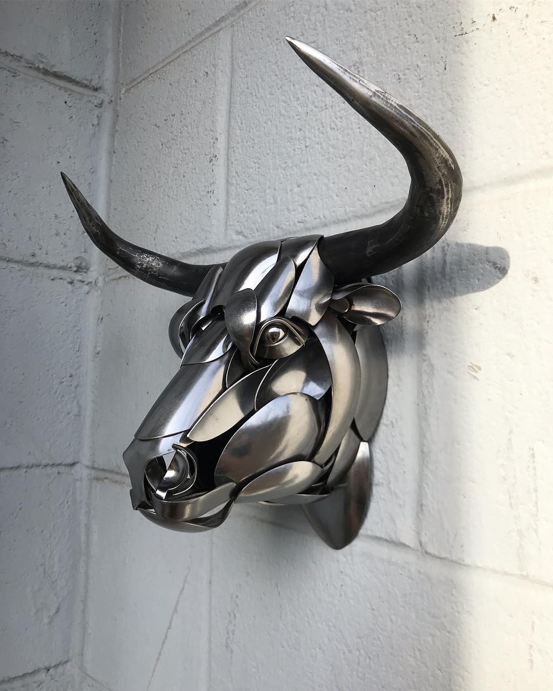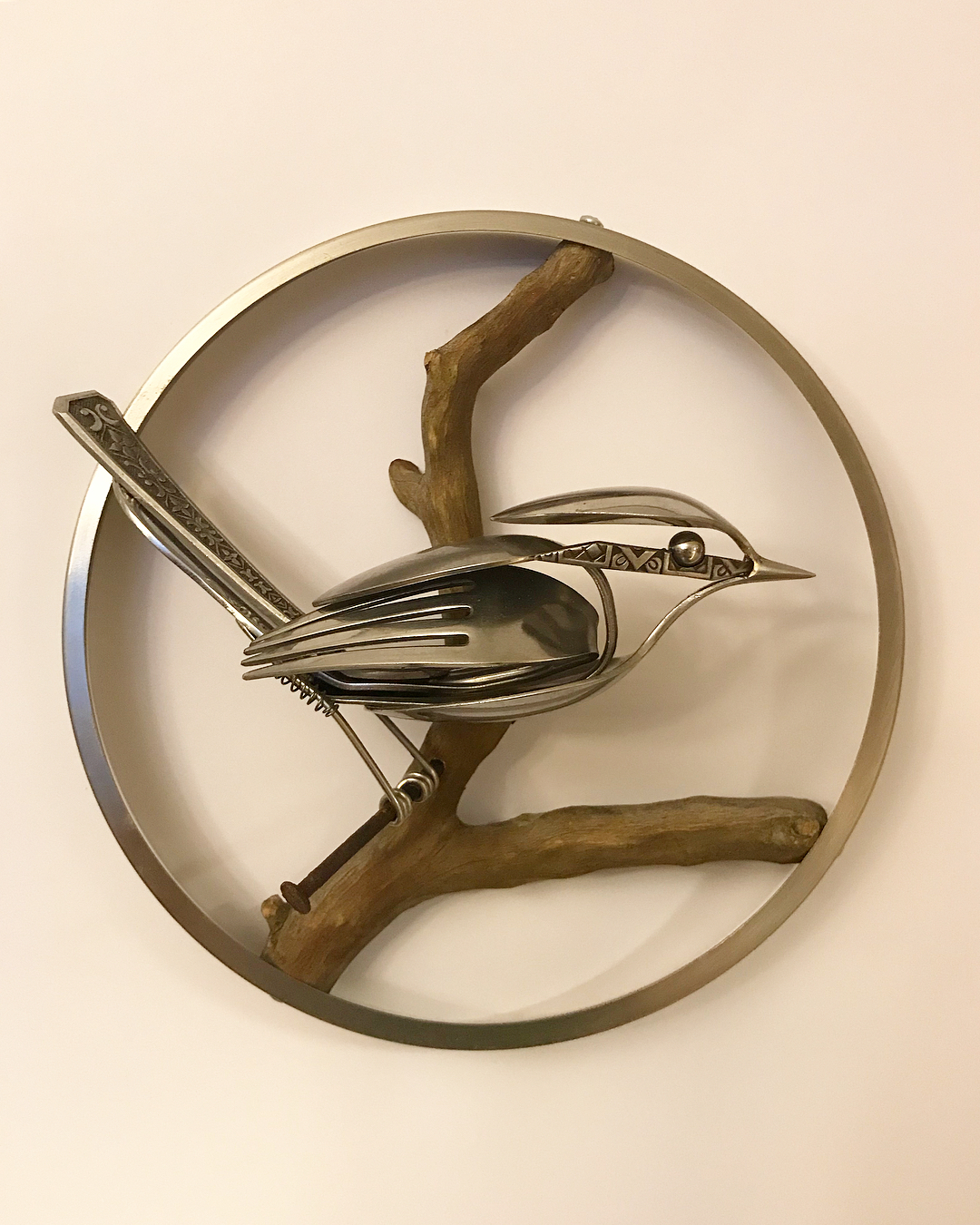 他的作品巧妙運用了餐具本身的弧度,形成了鳥類流線型的身體,比如用較大的餐勺創作鳥類光滑的肚皮,由餐刀組成的羽翼更是唯妙唯肖。