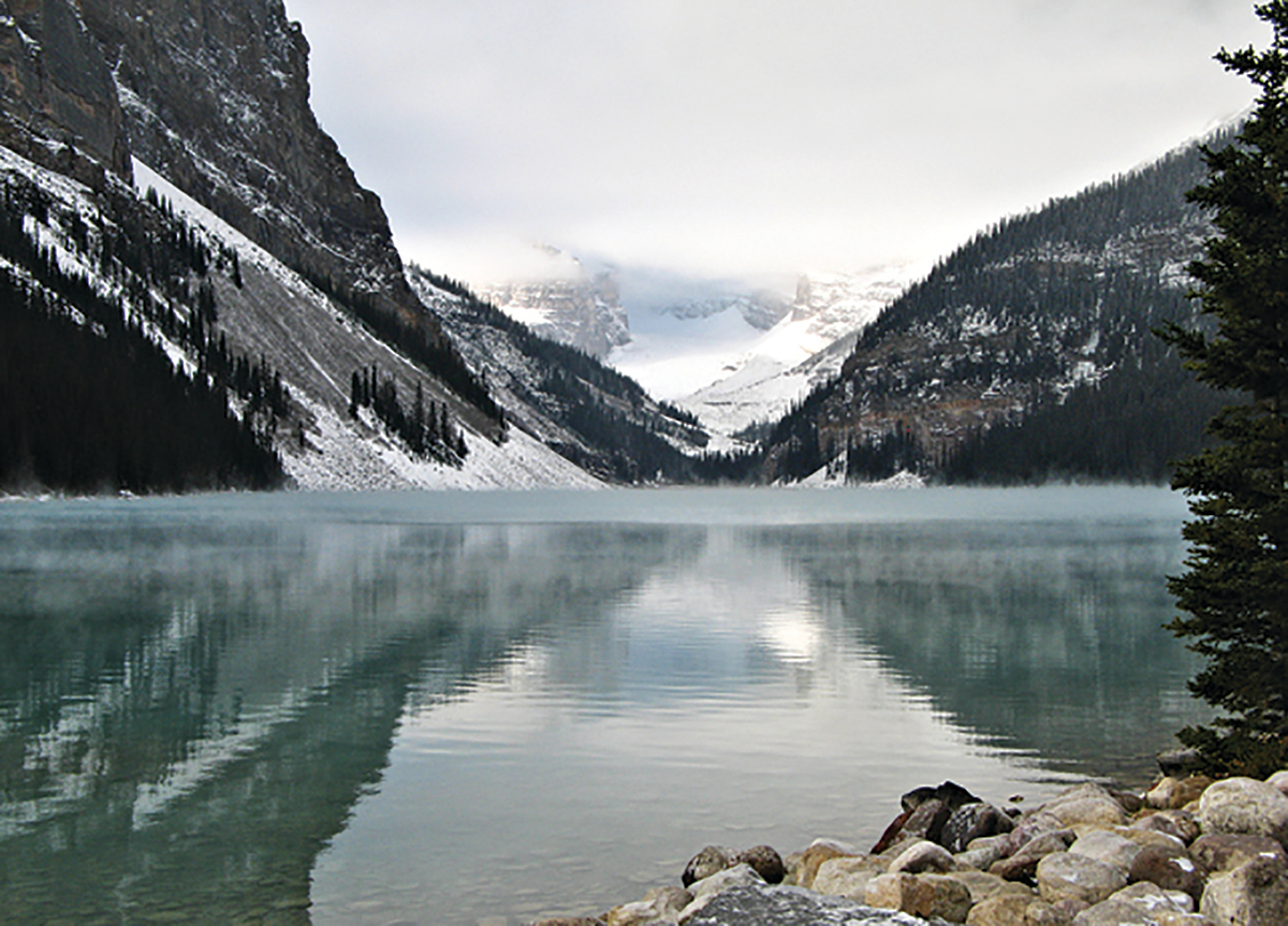 清晨的露易絲湖宿雲未散,朝霧尤濃,水面上覆一層薄幕輕紗,閉月羞花之態,朦朧中無法窺其全貌。湖對面的冰川也半藏在雲中,些許的光耀下,乍陰乍陽,極具變化。