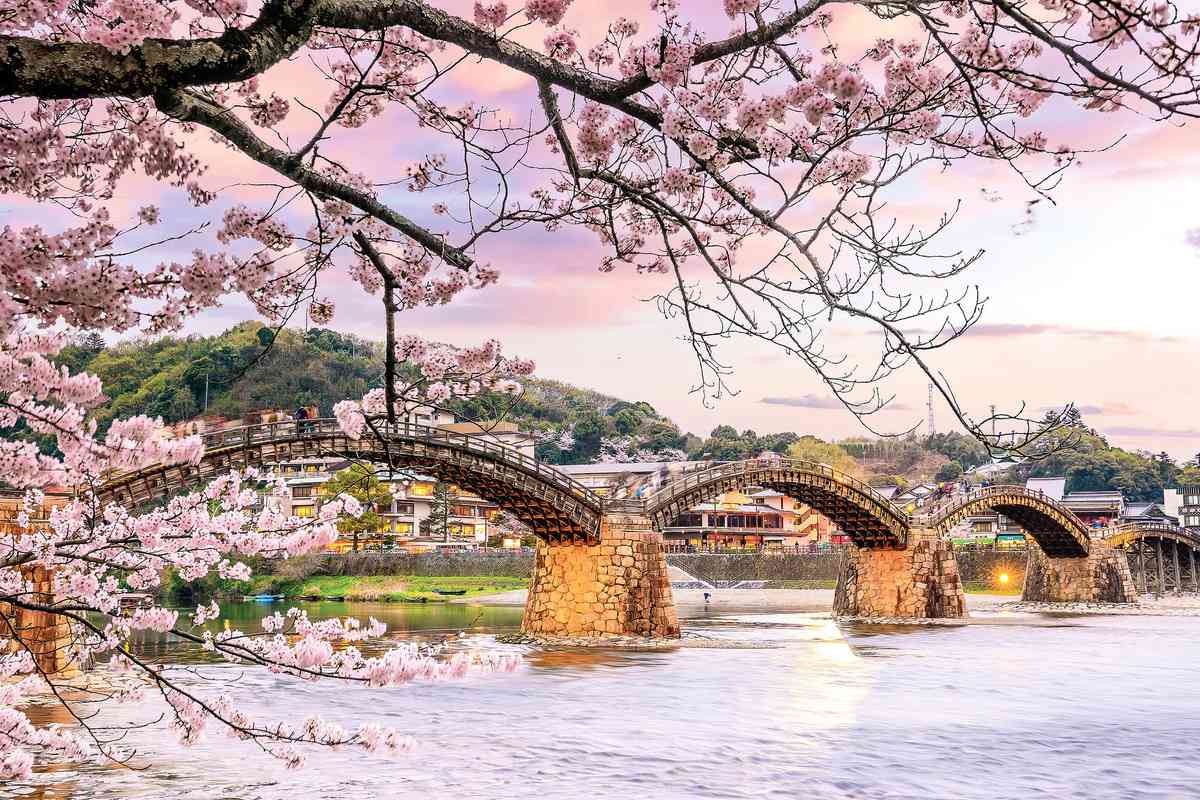 風景如畫的錦帶橋(Kintai Bridge)乃日本三大名橋之一,是一座橫跨錦川的五孔石墩木拱橋。全橋只用包鐵和插銷固定,以獨特的木結構連接而成。木橋長210米、寬5米、橋台高6.6米。最初建於 1673 年,1950年被一場颱風帶來的洪水摧毀,1953年重建,到2000 年代初期,進行了重建後的首次整修,至今雄踞於錦川的江面上。數百年來錦帶橋一直是日本岩國市最著名的地標和旅遊勝地。
