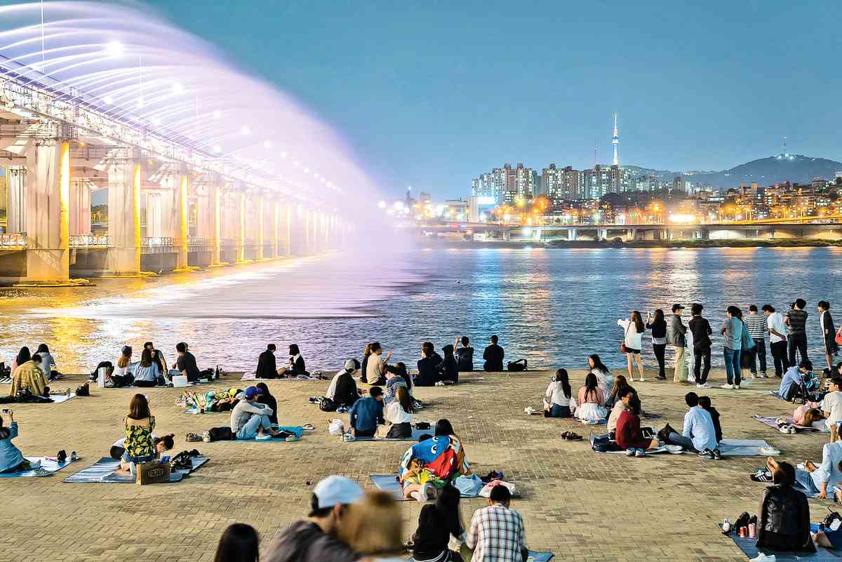 盤浦大橋(Banpo Bridge)是韓國漢江上首爾市中心的一座主要橋樑,連接瑞草和龍山區。它是韓國建造的第一座雙層橋,以月光彩虹噴泉表演為特色。這座噴泉被列入健力士世界紀錄,是世界上最長的橋式噴泉。大橋兩側有380個彩虹色噴氣機、200盞彩燈,五彩繽紛的水柱和燈光隨著音樂舞動,再加上夜幕降臨時數百種彩虹色的燈光組合,呈現出一場精采絕倫的景觀。每次噴泉表演持續20分鐘,以不同的音樂風格為特色,包括古典音樂、流行音樂、爵士樂、銅管樂隊和管弦樂隊。大橋全長1公里多,每年的 4 月至 10 月開放。