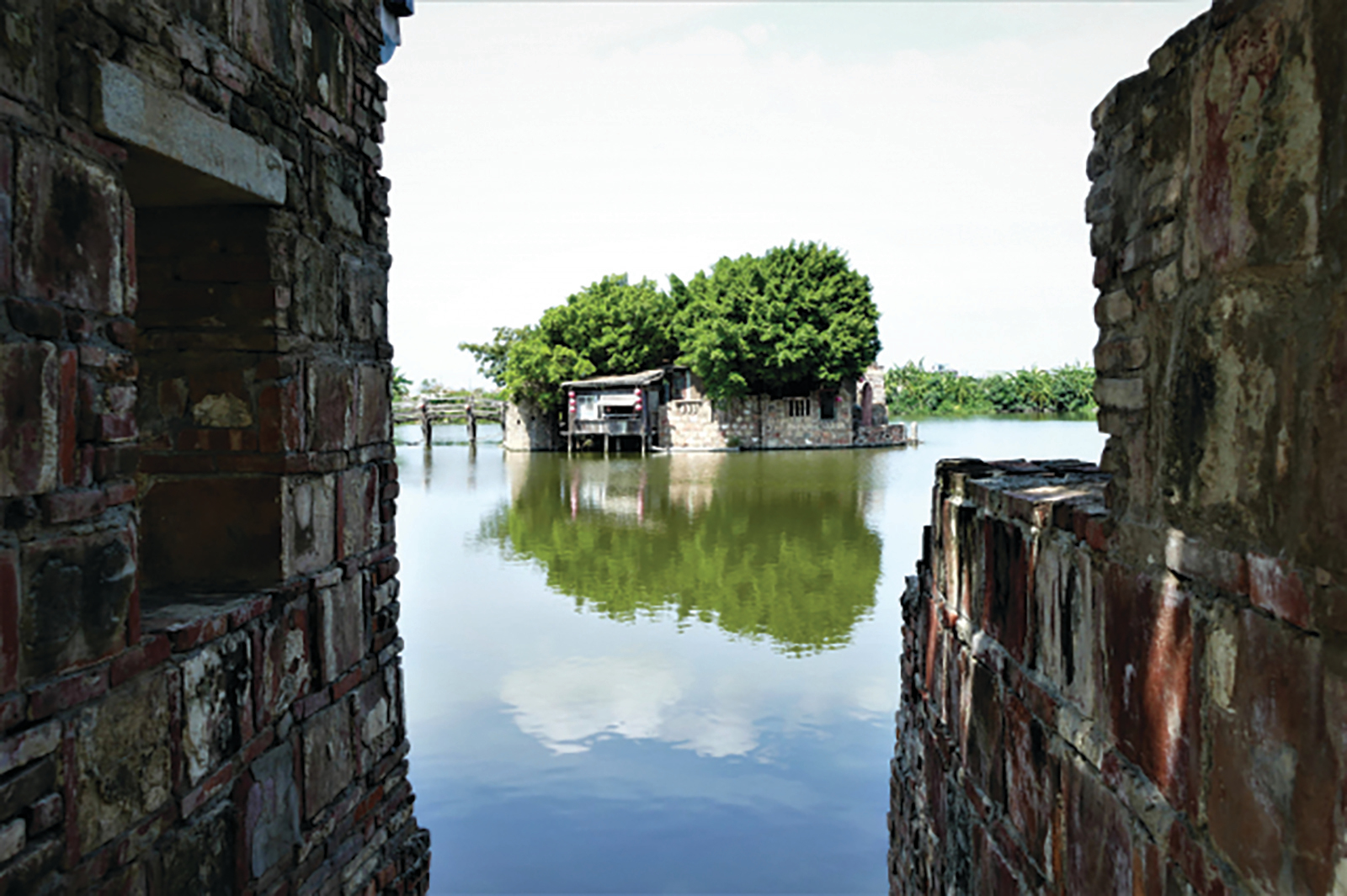 遊客來到這寧靜的鄉野,真的無法想像這裏有一個熱愛建築藝術的畫家,用他30年的人生歲月,在魚塭周邊打造一座藝術古城,在這只有魚群生活的老塘湖畔,營造一個時空錯置的仿古庭園。 魚塭水塘間 營造仿古庭園