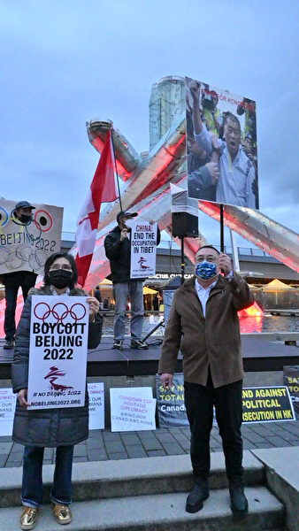 現場參加抗議的溫哥華民眾,有西藏人、維吾爾人、香港人、台灣人、中國大陸人等,他們打出抵制北京2022冬奧的橫幅與標語,高喊「沒有人權,沒有冬奧」、「停止新疆種族滅絕」、「還香港自由」、「還西藏自由」、「抵制北京冬奧會」等口號。