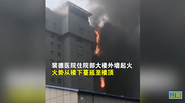 從影片中(點擊這裏)看,醫院住院部北側的整個外牆在大火中燃燒,濃煙滾滾,好像一條「火龍」;醫院內部有人員被困在濃煙中。