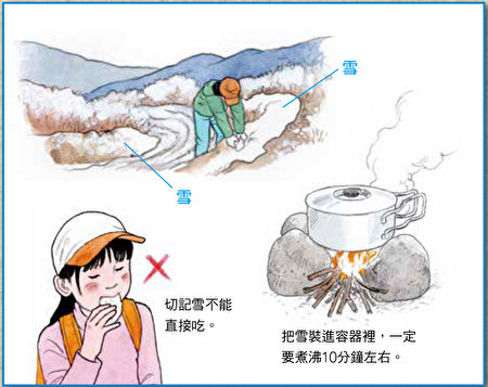 雪一定要加熱、融解後才能入口。煮沸一方面也能殺死細菌,比較衛生,還能讓發冷的身體暖和起來,使身體狀況變好。建議一次準備多天份的水,分成小份量裝進膠樽,放進衣服裏,使之接近體溫後再飲用。如果裏面摻雜了細小的樹枝或枯葉、沙土,要用紗布之類的過濾後再喝。